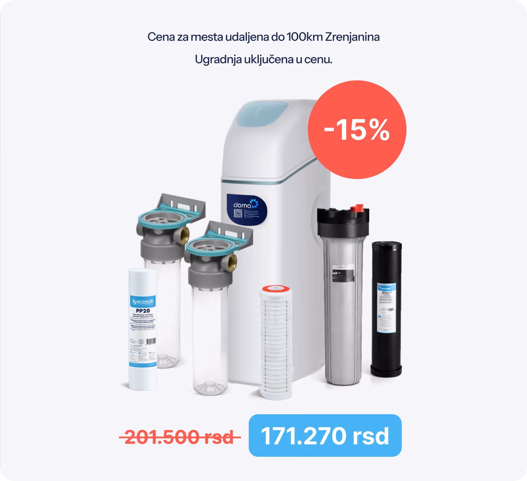 Fini filter dodatno prečišćava vodu pre ulaska u kućne instalacije, dok se otpadna voda iz regeneracije automatski odvodi.